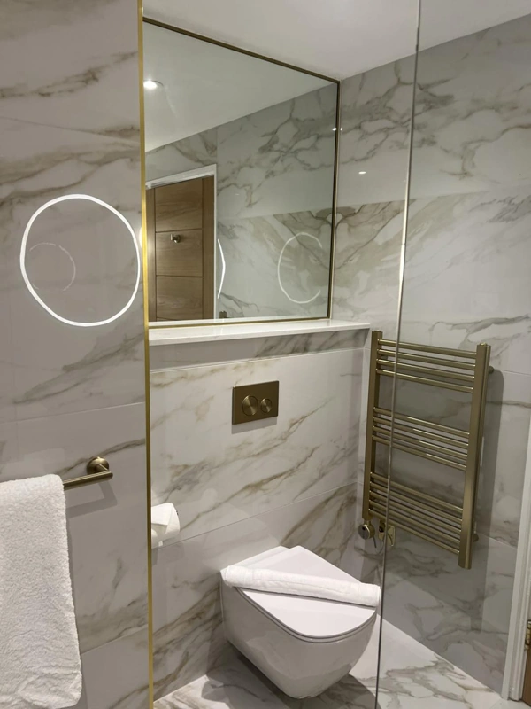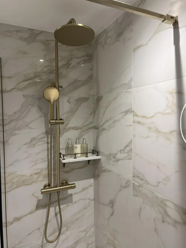 The design team chose the Endless Calacatta tile range, known for its elegant veining and timeless marble-inspired look. Paired with solid brass fittings and colour-matched grout, this combination creates a finish that is both sophisticated and long-lasting — perfectly suited for a 5-star hotel environment.